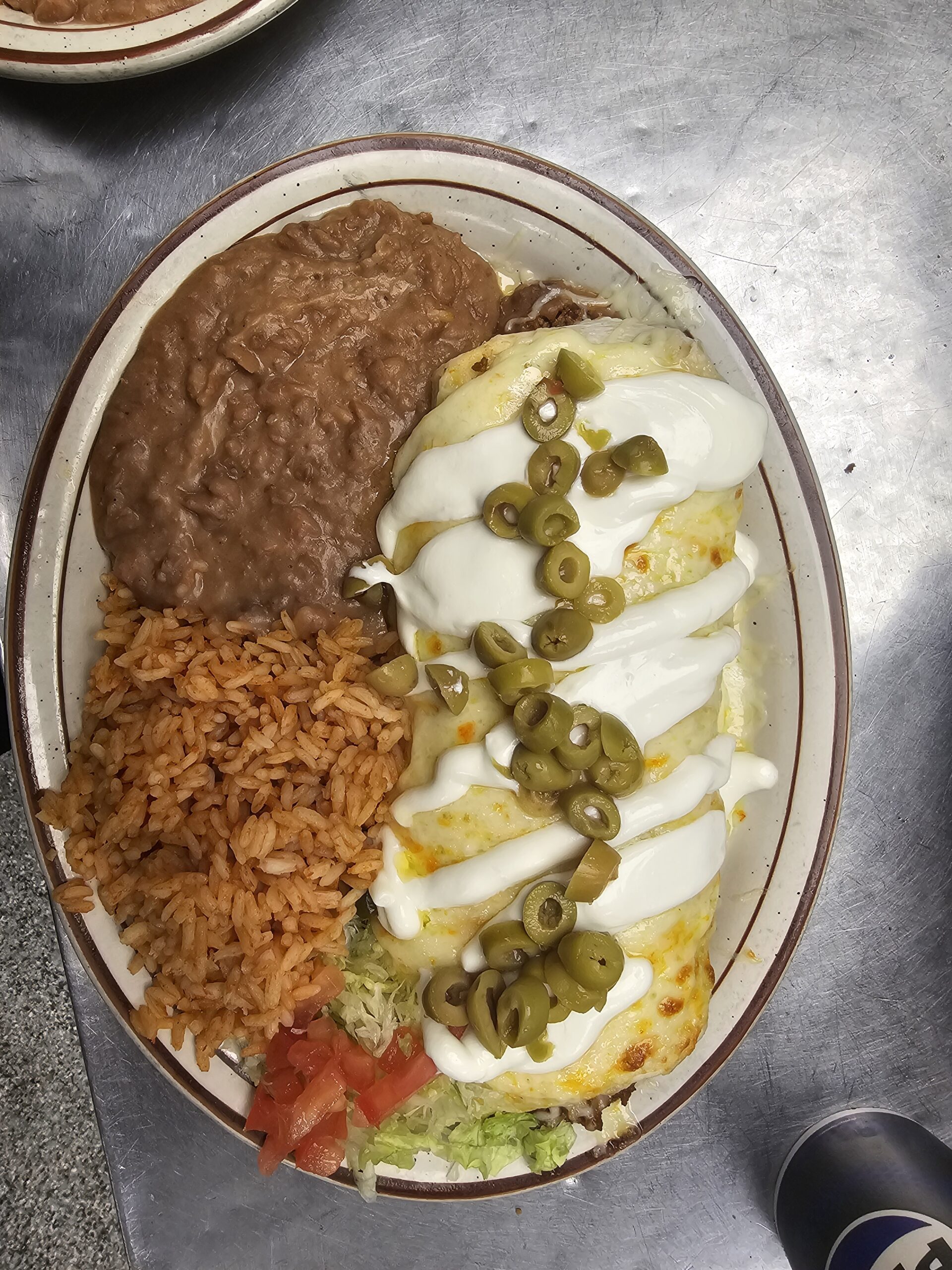 A large 10-inch flour tortilla generously filled with beans, melted cheese, sour cream, and sliced black olives, along with your choice of seasoned ground beef, hearty chunky beef, tender chicken, or flavorful pork. Served with refried beans and a side of Manuel’s signature rice for a hearty and flavorful meal.