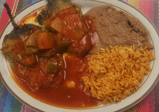 Two classic Mexican poblano peppers stuffed with melted cheese, lightly battered, and fried to golden perfection. Smothered in savory ranchero sauce add ground beef and served with refried beans and a side of Manuel’s signature rice for a hearty and flavorful meal, along with your choice of warm corn or flour tortillas.