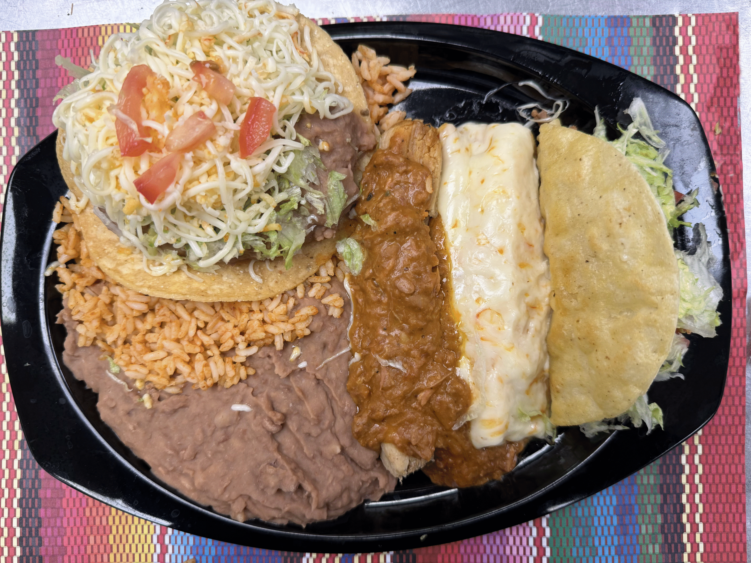 A hearty and flavorful meal featuring one ground beef taco in a soft corn tortilla, one crispy tostada topped with refried beans and melted cheese, one cheese and onion enchilada rolled in a corn tortilla and covered in rich enchilada sauce, and one tamale smothered in savory chili. Served with refried beans and a side of Manuel’s signature rice for a hearty and flavorful meal.