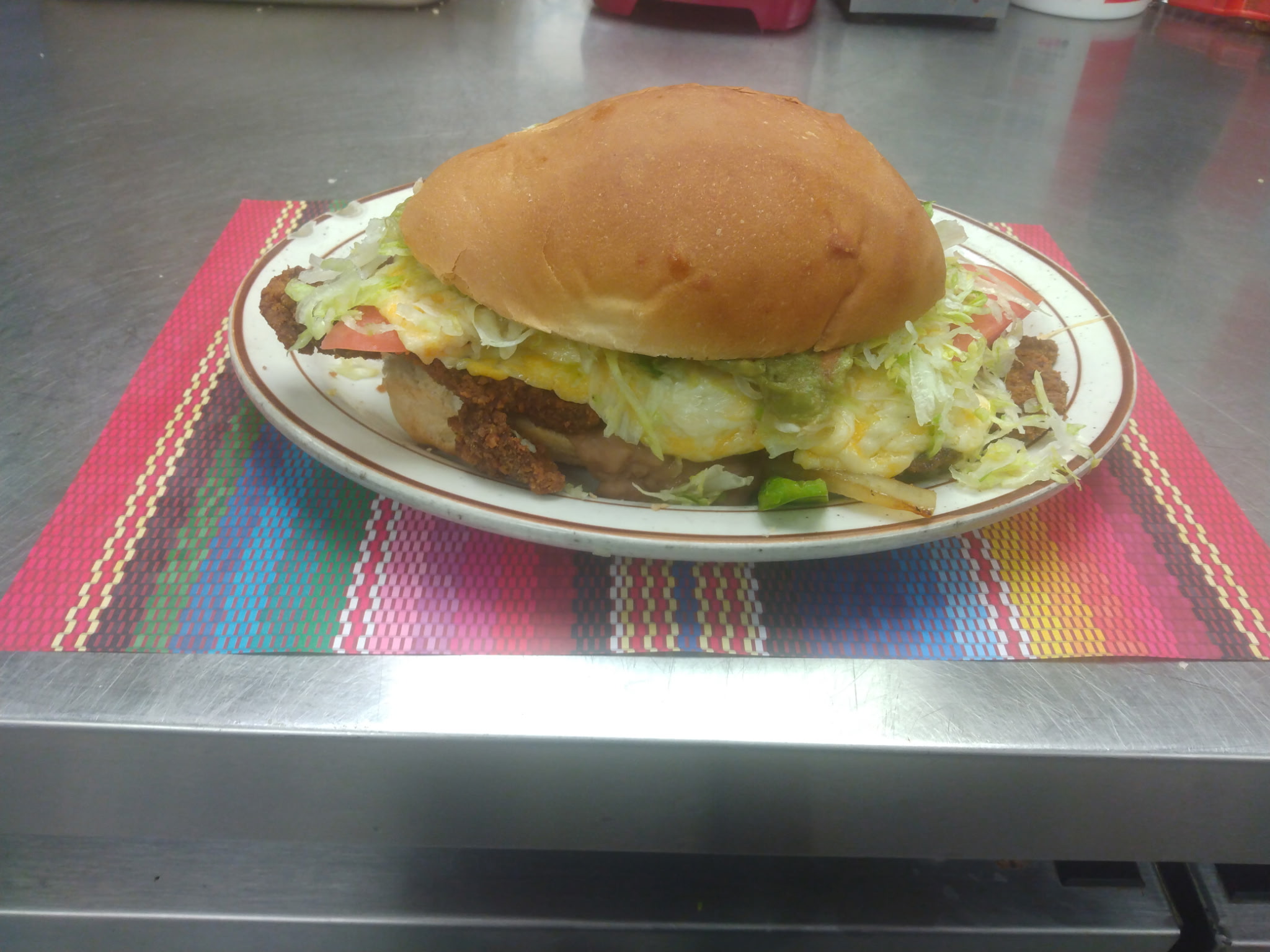 A warm and satisfying Mexican-style sandwich filled with your choice of grilled chicken, tender steak, or savory chorizo with egg. Layered with sautéed green peppers, onions, and tomatoes, then topped with guacamole and refried beans on a toasted roll. A bold and flavorful handheld favorite.