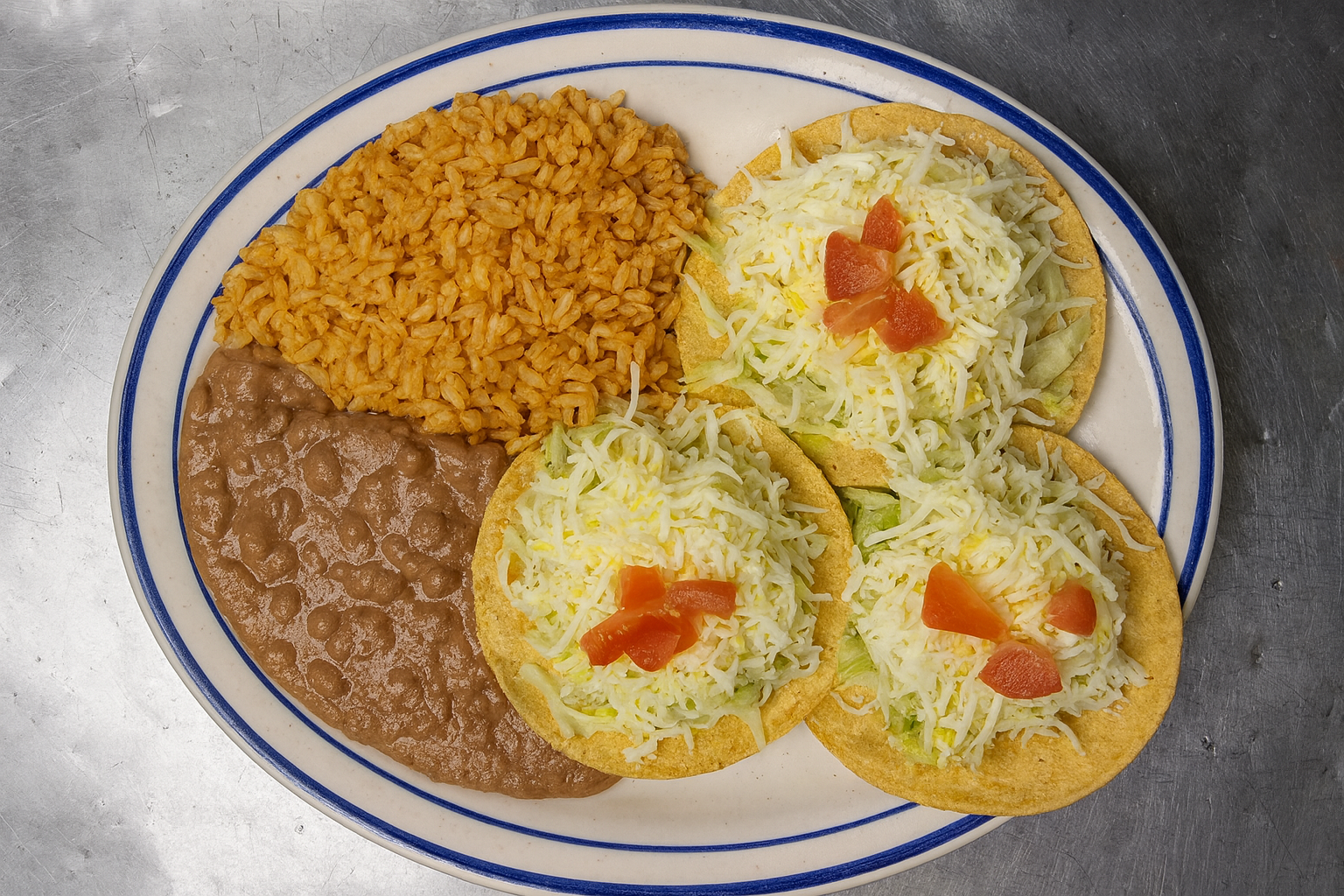 Three crispy tostadas topped with refried beans and melted cheese, or include your choice of seasoned ground beef, hearty chunky beef, tender chicken, or flavorful pork. Finished with fresh lettuce and diced tomatoes. Served with refried beans and a side of Manuel’s signature rice for a hearty and flavorful meal.